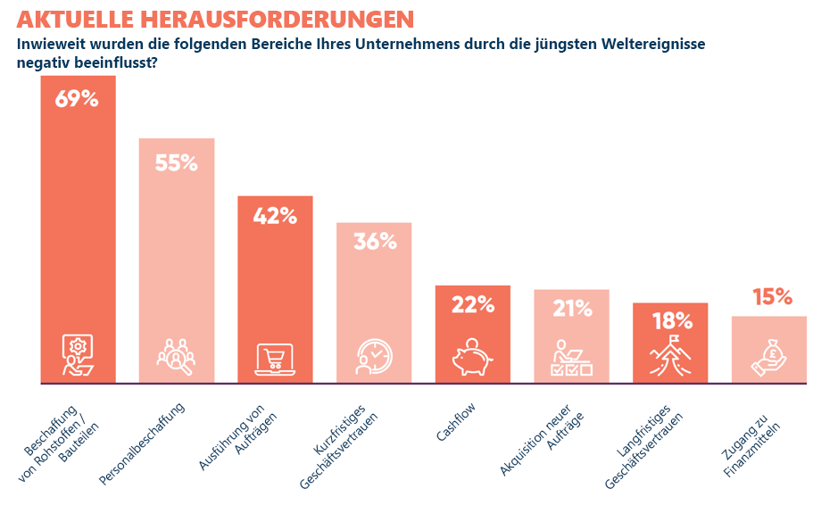 Während unserer Bewertung haben wir Hersteller auch dazu befragt, in welchen Bereichen sie – abgesehen von COVID – am meisten von den jüngsten Weltgeschehnissen sowie inländischen Faktoren beeinträchtigt wurden. Das Ergebnis: Wie im Jahr 2021 auch gab es bei der Beschaffung von Rohstoffen und Komponenten die meisten Probleme. Dabei ist der Anteil der Hersteller, die diesen Aspekt 2022 als ihre größte Herausforderung ansahen (69 %), gegenüber dem Vorjahr (75 %) nur geringfügig zurückgegangen.