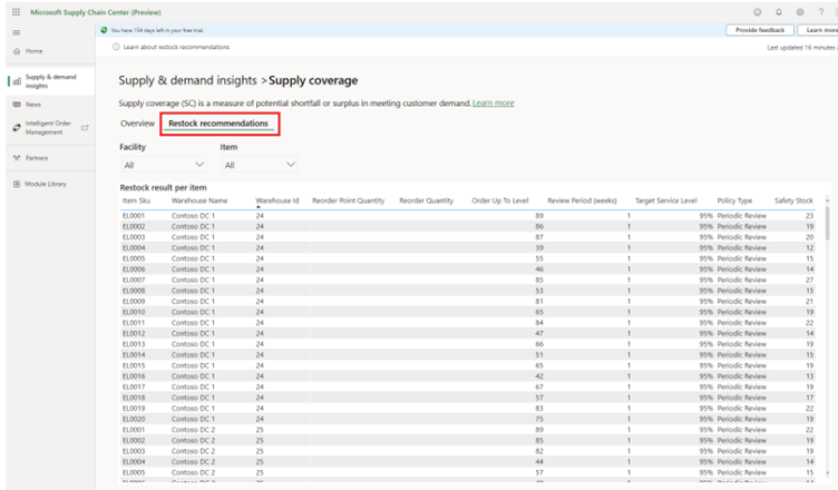 Supply Coverage is een indicator die je helpt bepalen of de aanwezige voorraad en de goederen die verwacht worden zullen voldoen aan de klantvraag voor een specifieke periode. Microsoft biedt met het platform niet alleen het inzicht; maar stelt je ook in staat door middel van AI componenten te werken aan het continu optimaliseren van de voorraad parameters. Om concreet aan de slag te gaan met het verhogen van Supply Coverage zijn bijvoorbeeld slimme restock aanbevelingen beschikbaar. Deze geven jou een besteladvies voor een specifiek artikel, evenals de aanbevolen veiligheidsvoorraad. Voor locaties of entiteiten waar je geen externe (dure) gespecialiseerde applicatie voor voorraadbeheer wilt inzetten is dit een interessante mogelijkheid.