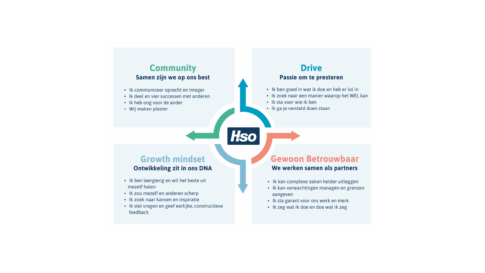 Het kompas geeft richting aan waar we als HSO voor staan en hoe we met elkaar omgaan, zowel intern als extern naar onze klanten en partners.